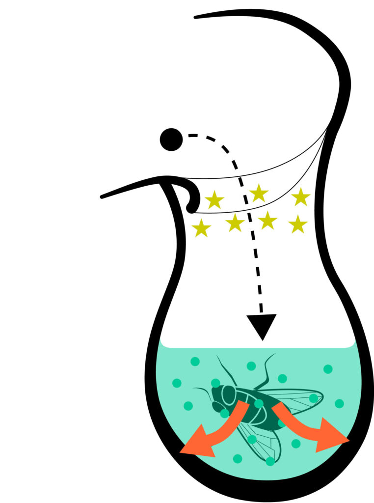 2. The prey slips and falls into enzyme-filled liquid, where it’s digested and absorbed.