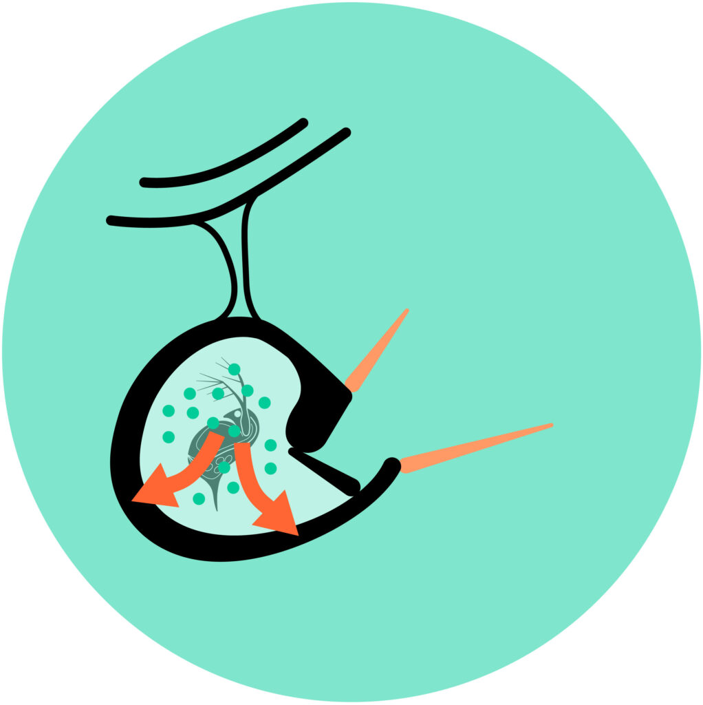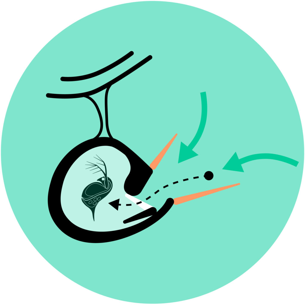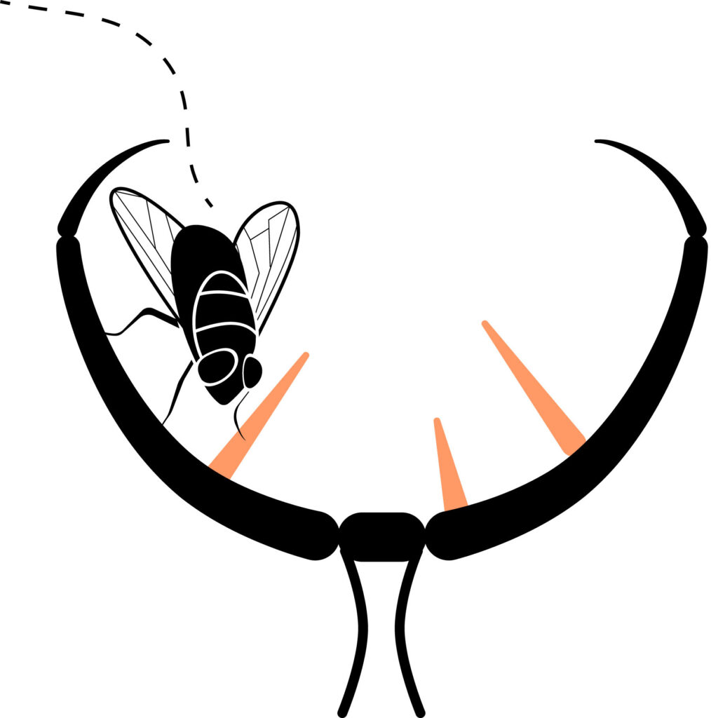 1. Trigger hairs (shown in orange) snap the trap shut when touched by its prey.