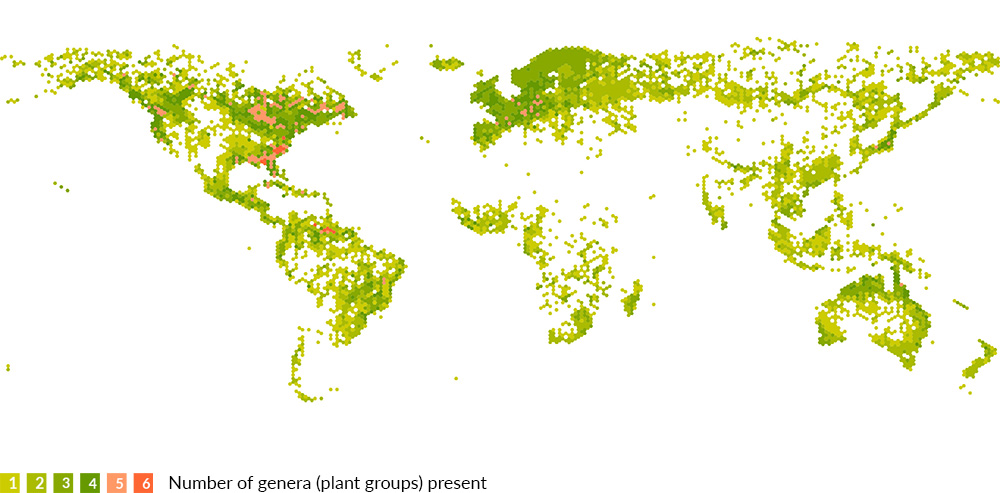 By contrast, places like Southeast Asia and Australia are home to many species from only a few genera, while North Carolina — home of the Venus flytrap — sits within one of the largest red zones on Earth.