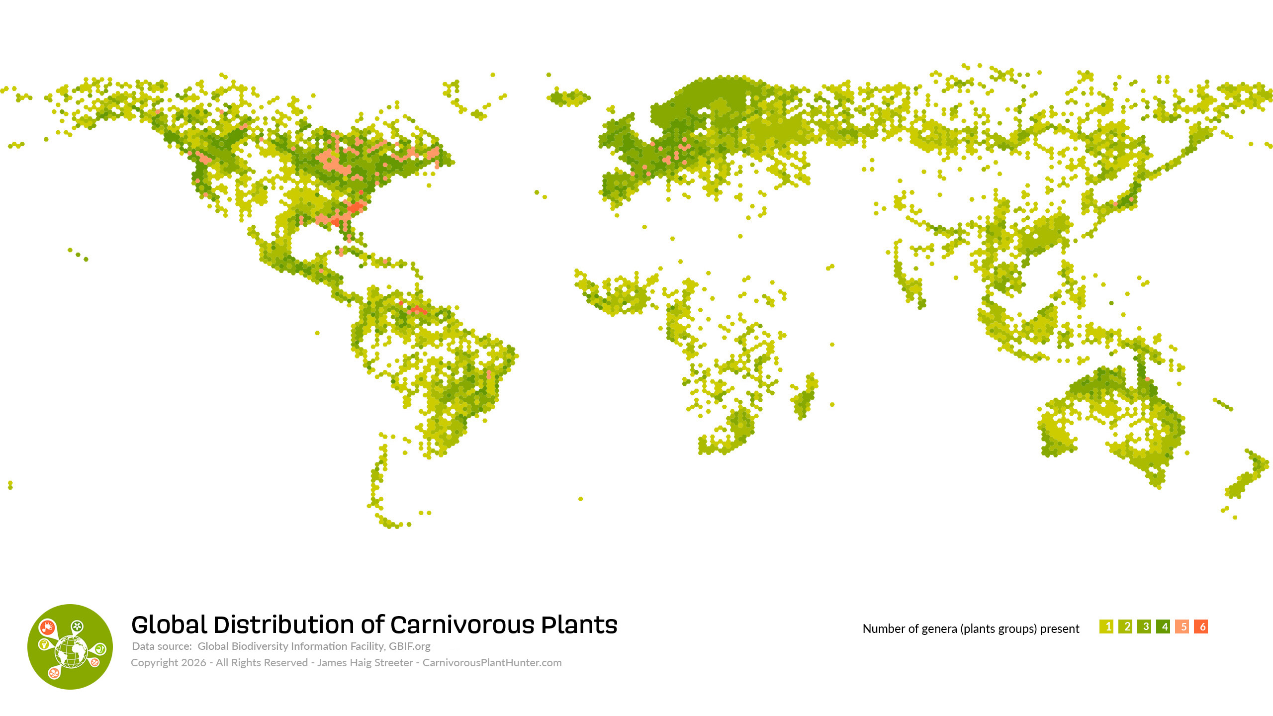 [Click to expand to full-screen] Map created by overlying the distribution of all carnivorous plant genera. Data source: Global Biodiversity Information Facility, GBIF.org // Image credit: James Haig Streeter – CarnivorousPlantHunter.com